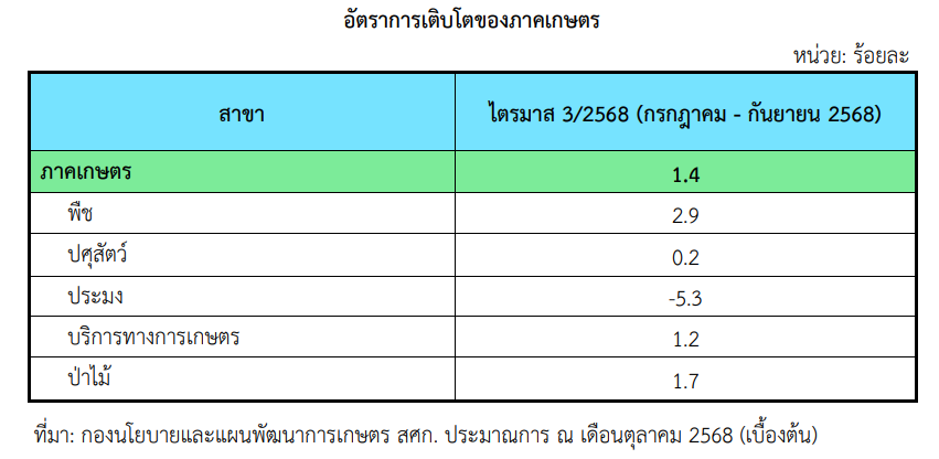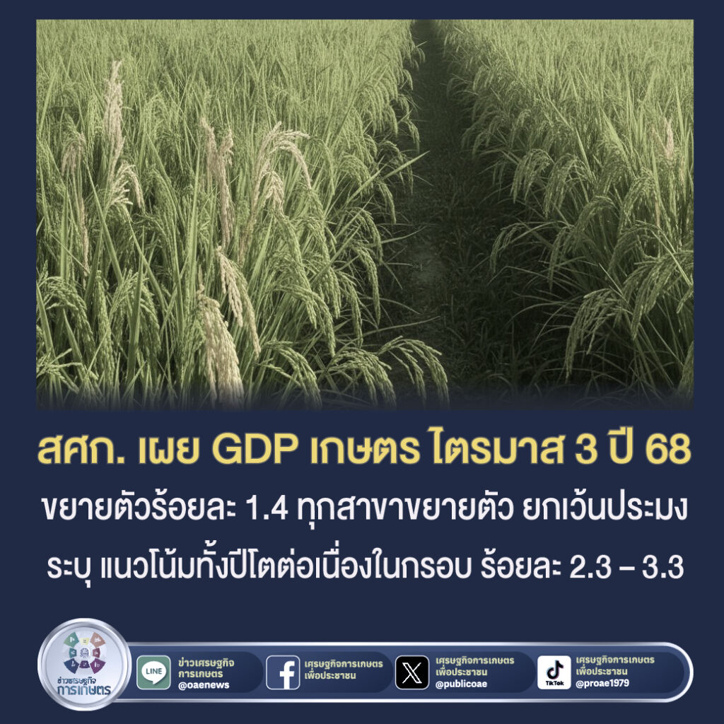สศก. เผย GDP เกษตร ไตรมาส 3 ปี 68 ขยายตัวร้อยละ 1.4 ทุกสาขาขยายตัว ยกเว้นประมงระบุ แนวโน้มทั้งปีโตต่อเนื่องในกรอบ ร้อยละ 2.3 – 3.3
